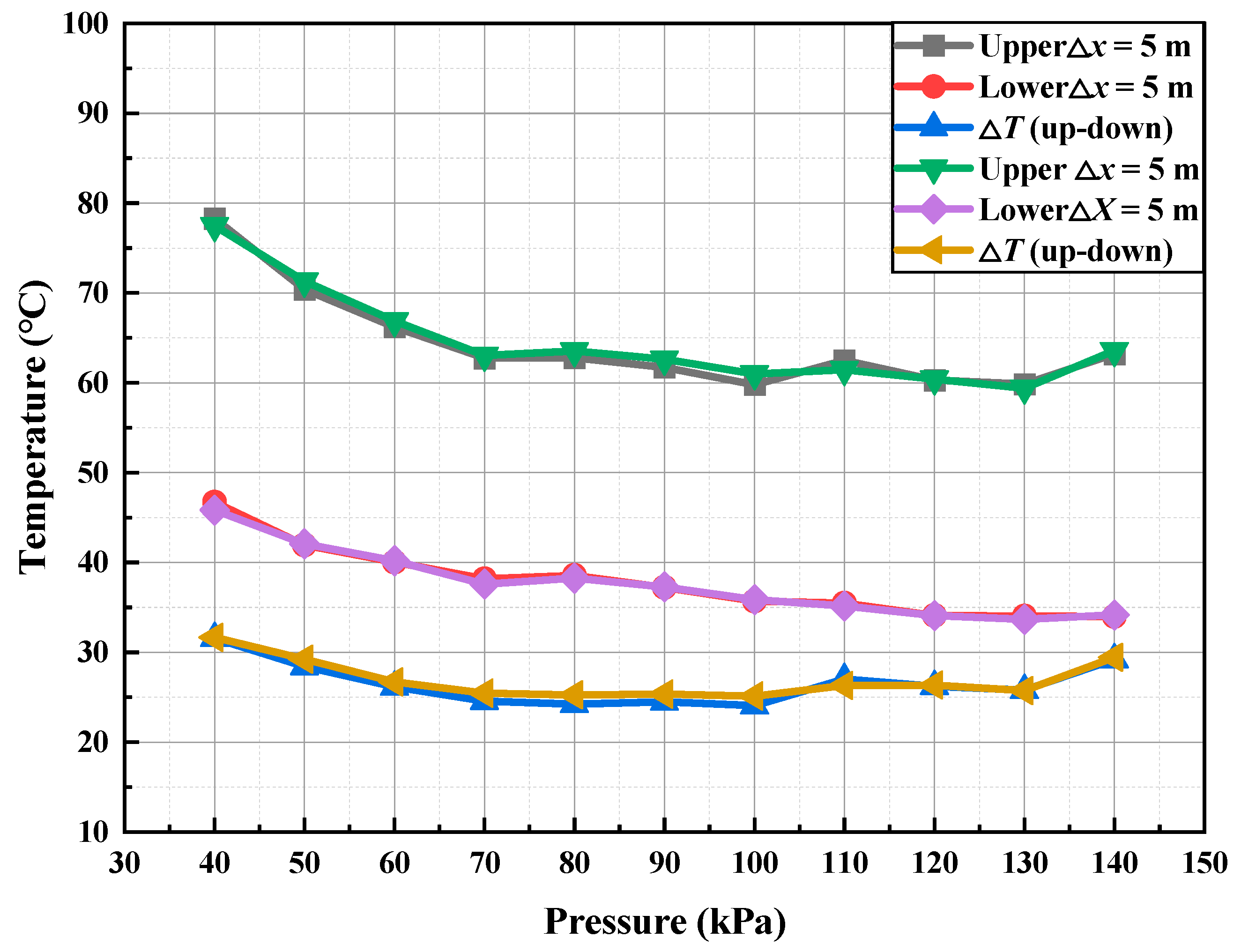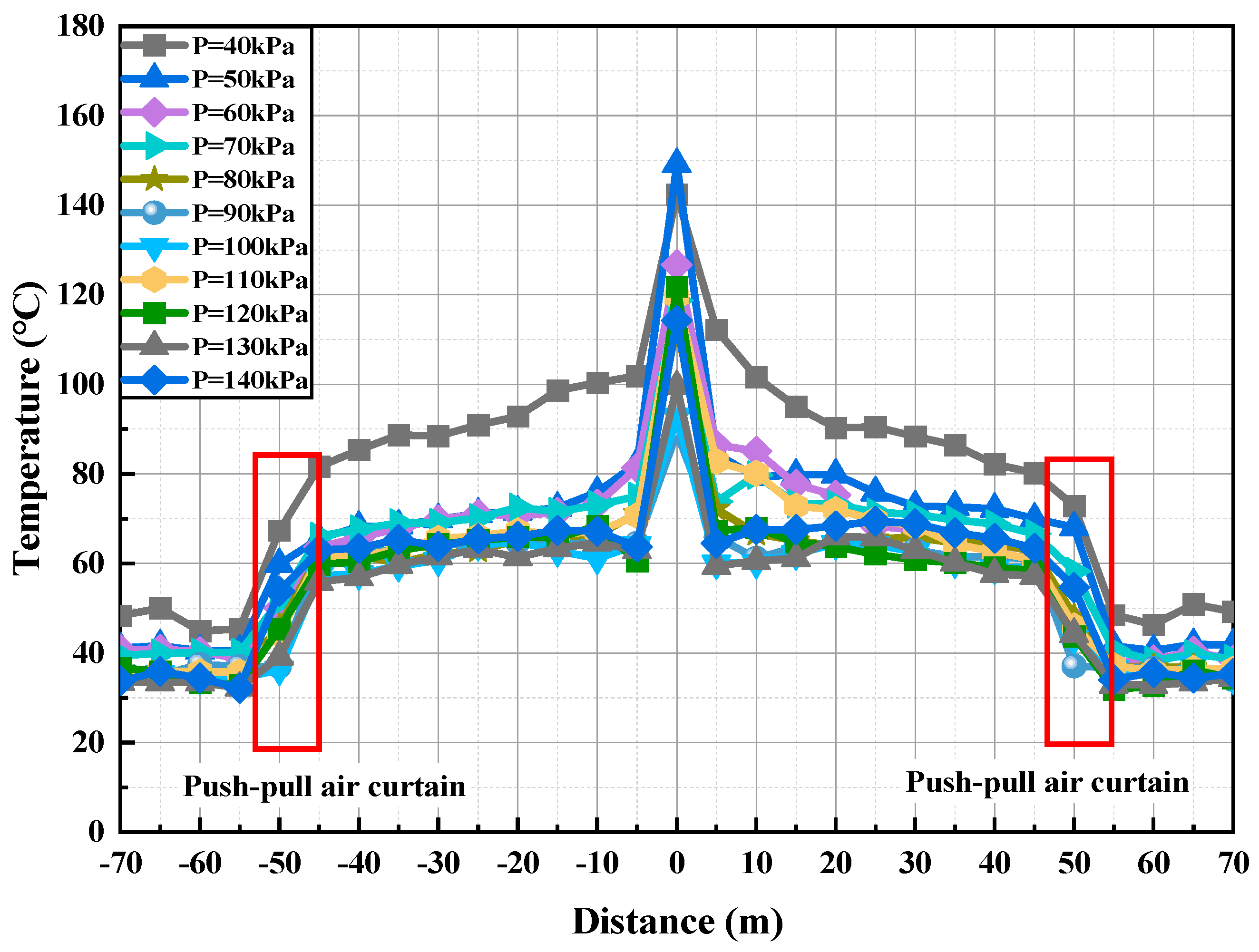 Figure 17 analyzes ceiling thermal stratification under differential atmospheric pressure regimes, with the fire source centered in the tunnel and paired air curtains deployed 50 m from both portals. Test parameters include 5 MW combustion intensity (HRR) and 10 m/s airflow velocity. Environmental pressure varies from 40 to 140 kPa, and transient simulation data are averaged around 400 s for analysis. The results indicate that as the environmental pressure increases, the overall ceiling temperature decreases. The transverse air curtain effectively reduces downstream smoke temperature and concentration, as high-temperature smoke rapidly cools after passing through it; consequently, the temperature difference between the upstream and downstream regions decreases and stabilizes with increased pressure. For example, in the 40–60 m region from the air curtain, at 40 kPa the upstream temperature is 80.2 °C (±0.5 °C) and the downstream temperature is 46.4 °C (±0.5 °C) (ΔT = 33.8 °C), while at 130 kPa these values decrease to 57.3 °C (±0.5 °C) and 32.8 °C (±0.5 °C) (ΔT = 24.4 °C).