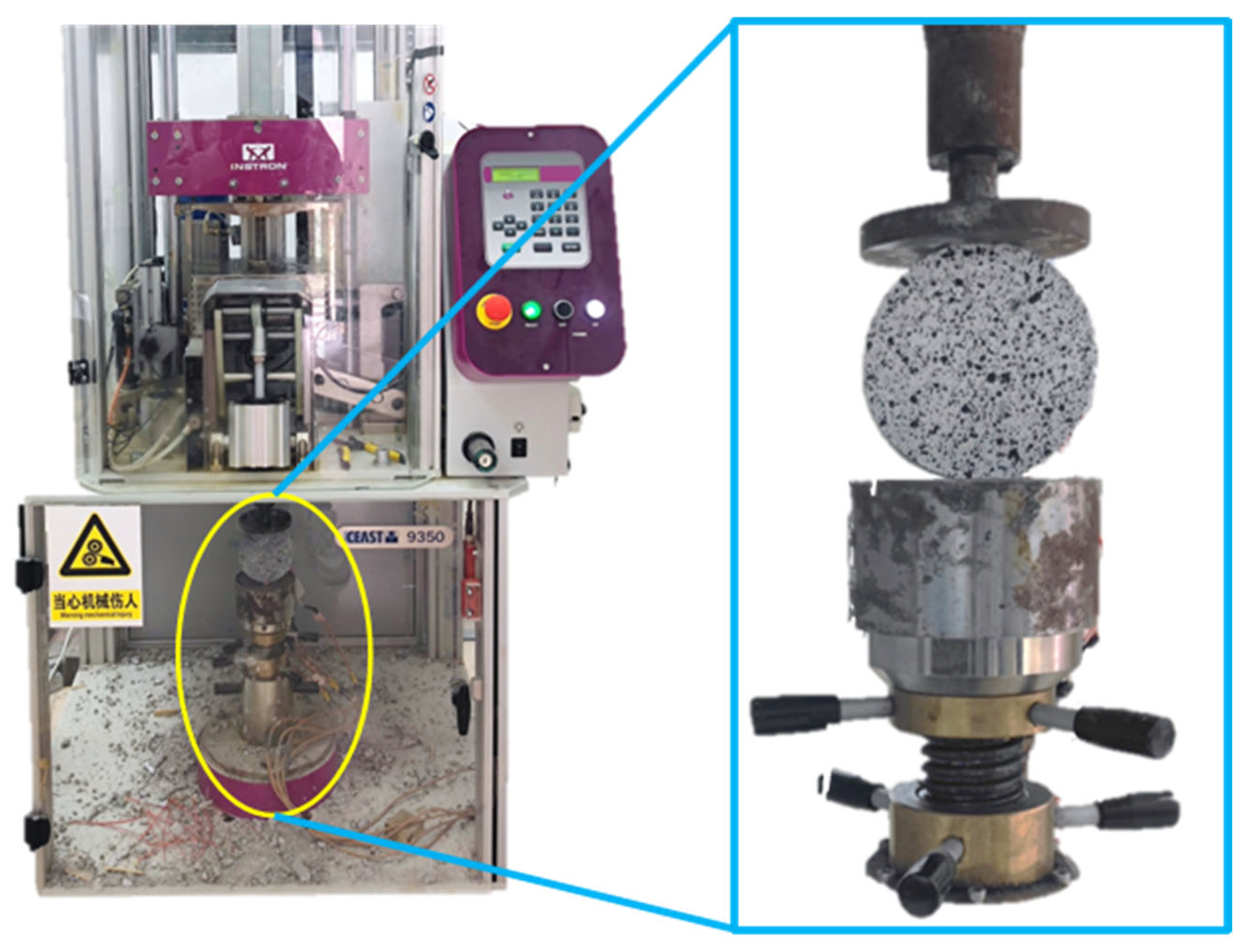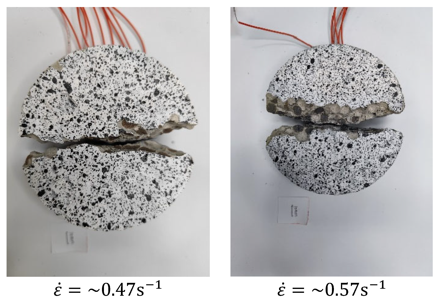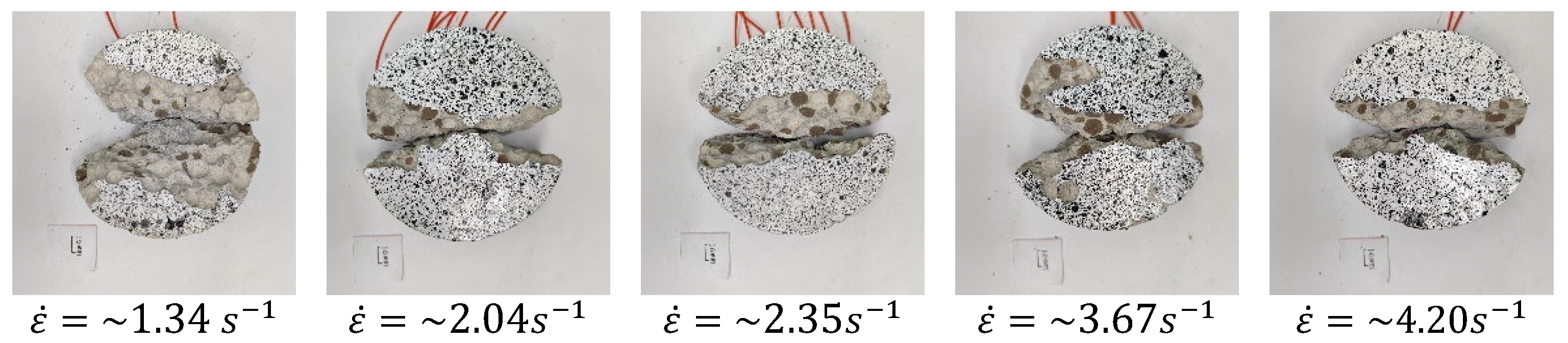 - Jin, X.; Hou, C.; Fan, X.; Lu, C.; Yang, H.; Shu, X.; Wang, Z. Quasi-Static and Dynamic Experimental Studies on the Tensile Strength and Failure Pattern of Concrete and Mortar Discs. Sci. Rep. 2017, 7, 15305. [Google Scholar] [CrossRef]