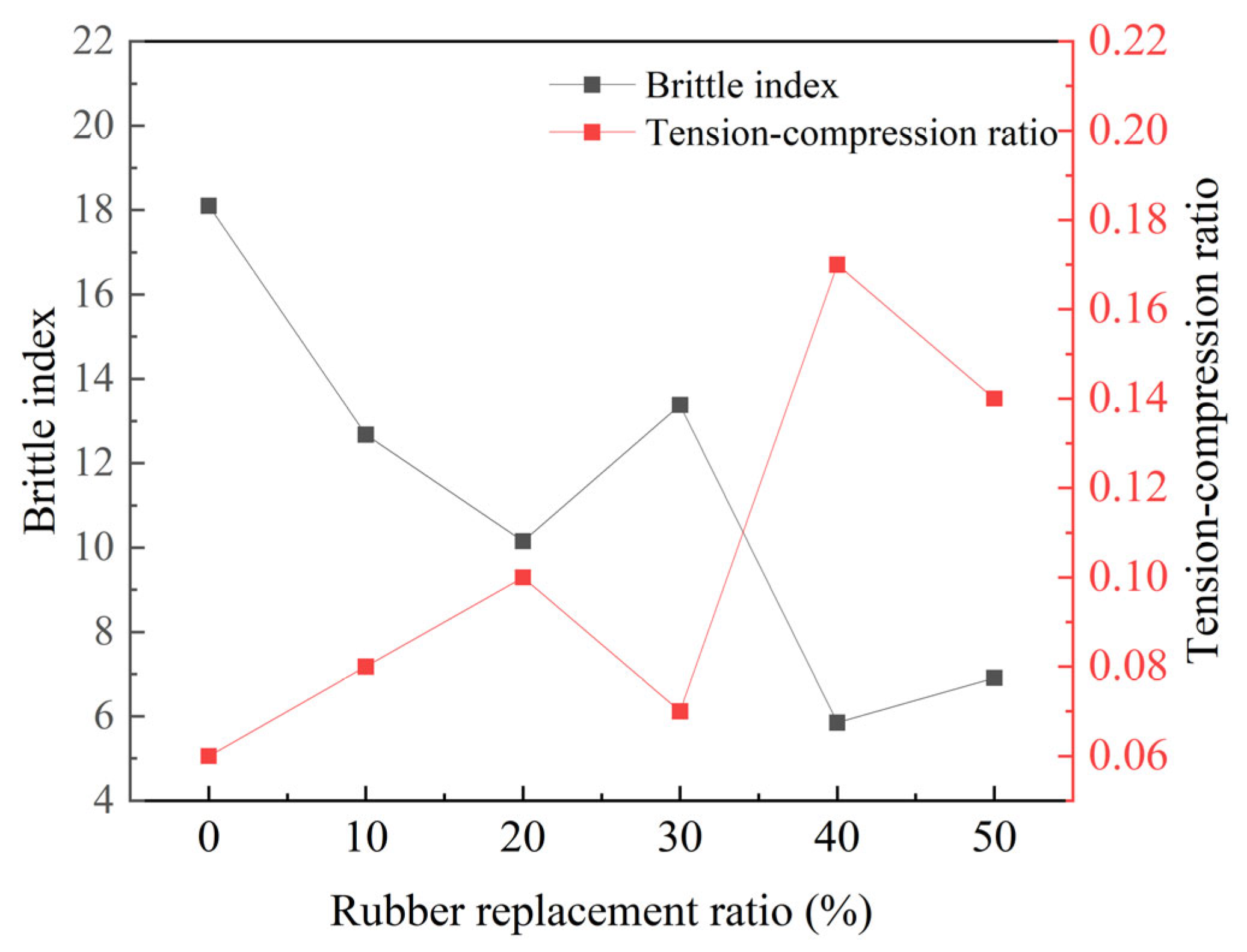 - The static compressive strength of Rubber-Toughened Ceramsite Concrete (RTCC) was lower than that of ordinary concrete, while the static splitting tensile strength first increased and then decreased with increasing rubber replacement ratio. In particular, when the rubber replacement ratio was 20%, the tensile strength reached its maximum value of 2.01 MPa, and the tension–compression ratio increased by 66.7%, significantly enhancing the crack resistance of the material. A moderate amount of rubber effectively improved toughness, whereas excessive rubber content weakened the interfacial bonding performance.