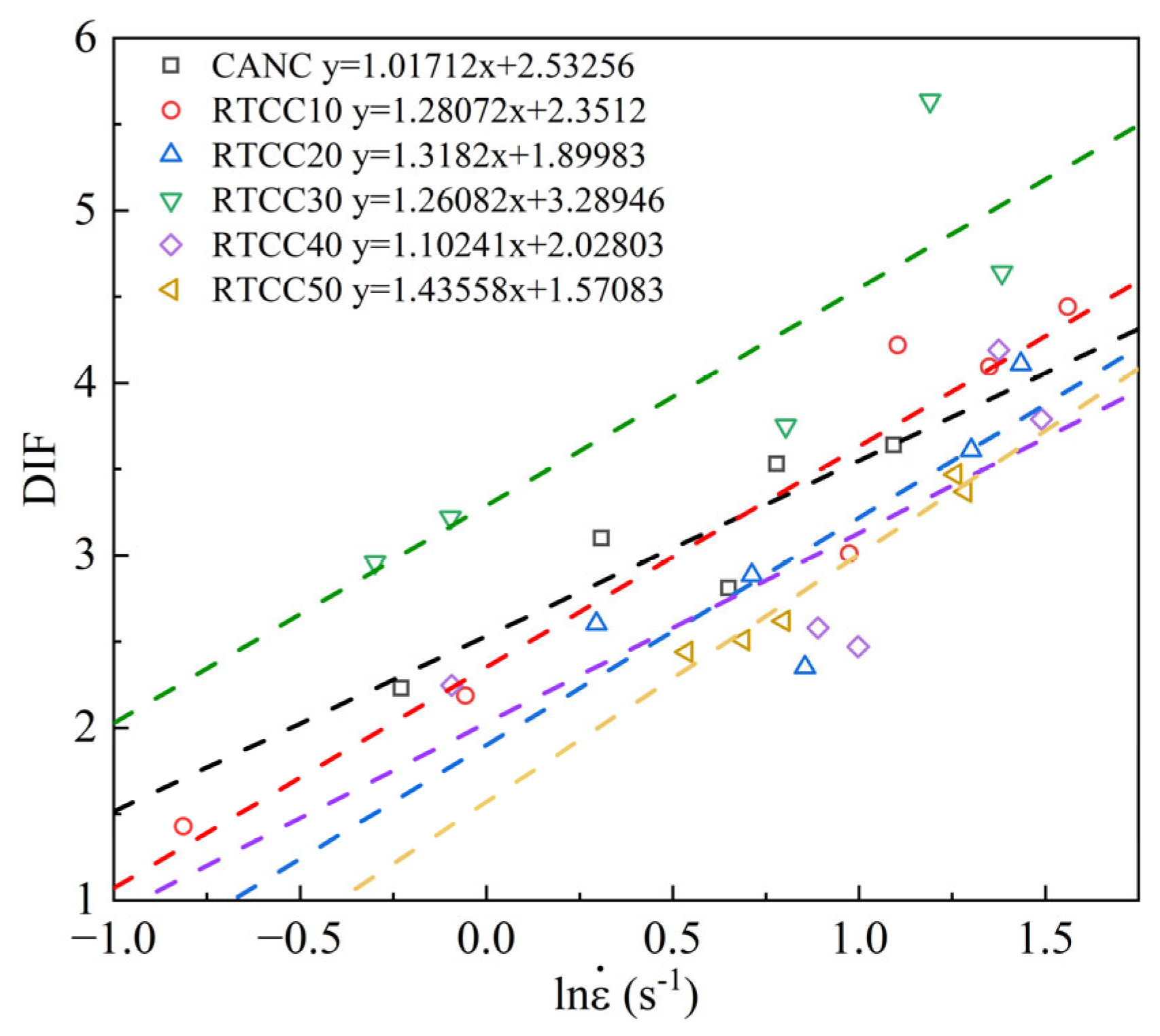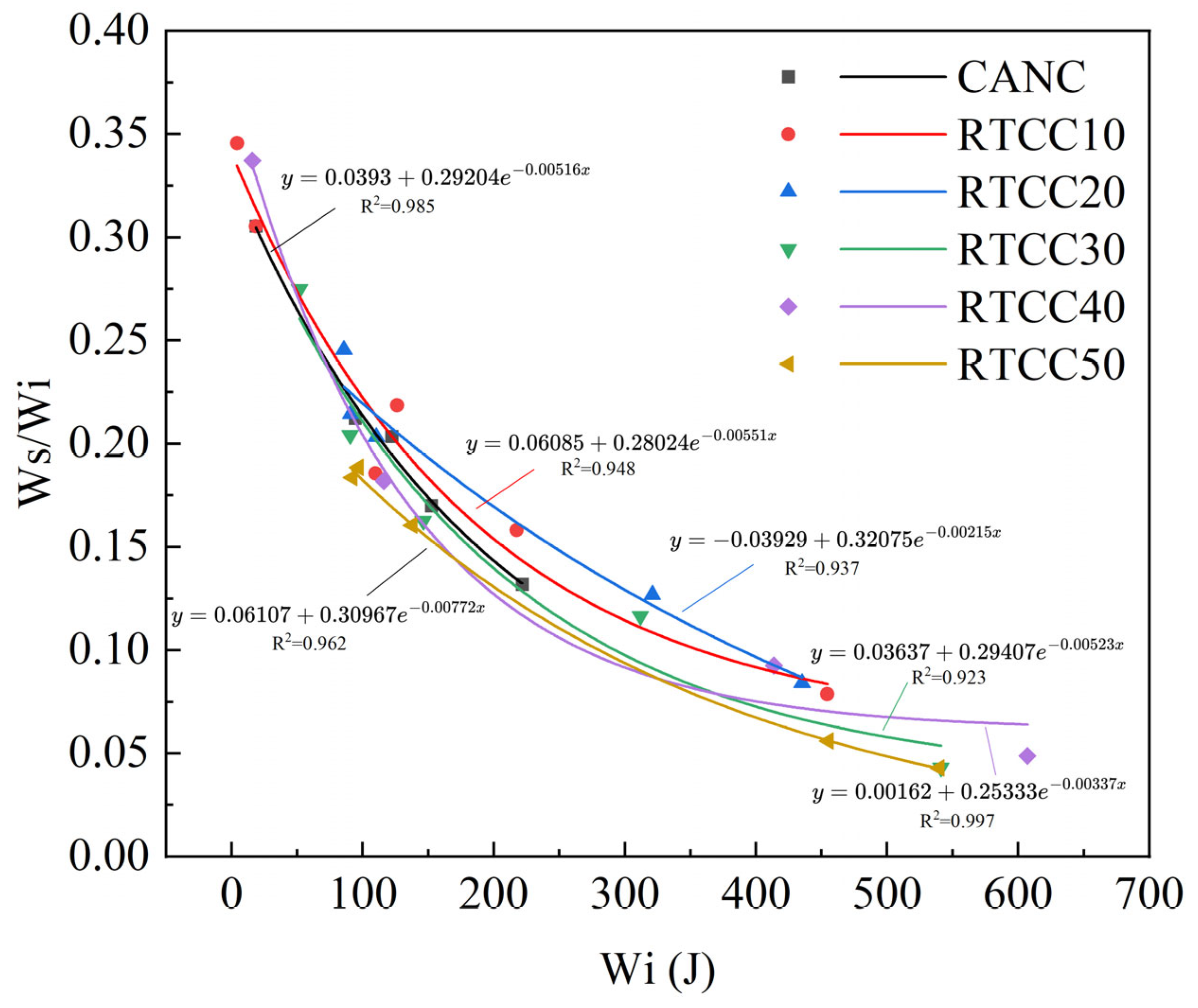 - Under high strain rates (SHPB tests), Rubber-Toughened Ceramsite Concrete (RTCC) exhibited pronounced strain-rate sensitivity, with the DIF increasing significantly as the strain rate rose. As the rubber replacement ratio increased, the slope of the DIF- curve gradually decreased, indicating that the incorporation of rubber reduced the strain-rate sensitivity of the concrete but improved its initial strength under low-velocity impacts. Moreover, at higher strain rates, due to the superior energy absorption capability of rubber, RTCC demonstrated greater energy dissipation capacity than ordinary ceramsite concrete. However, the overall energy dissipation capacity tended to decrease with further increases in rubber content.