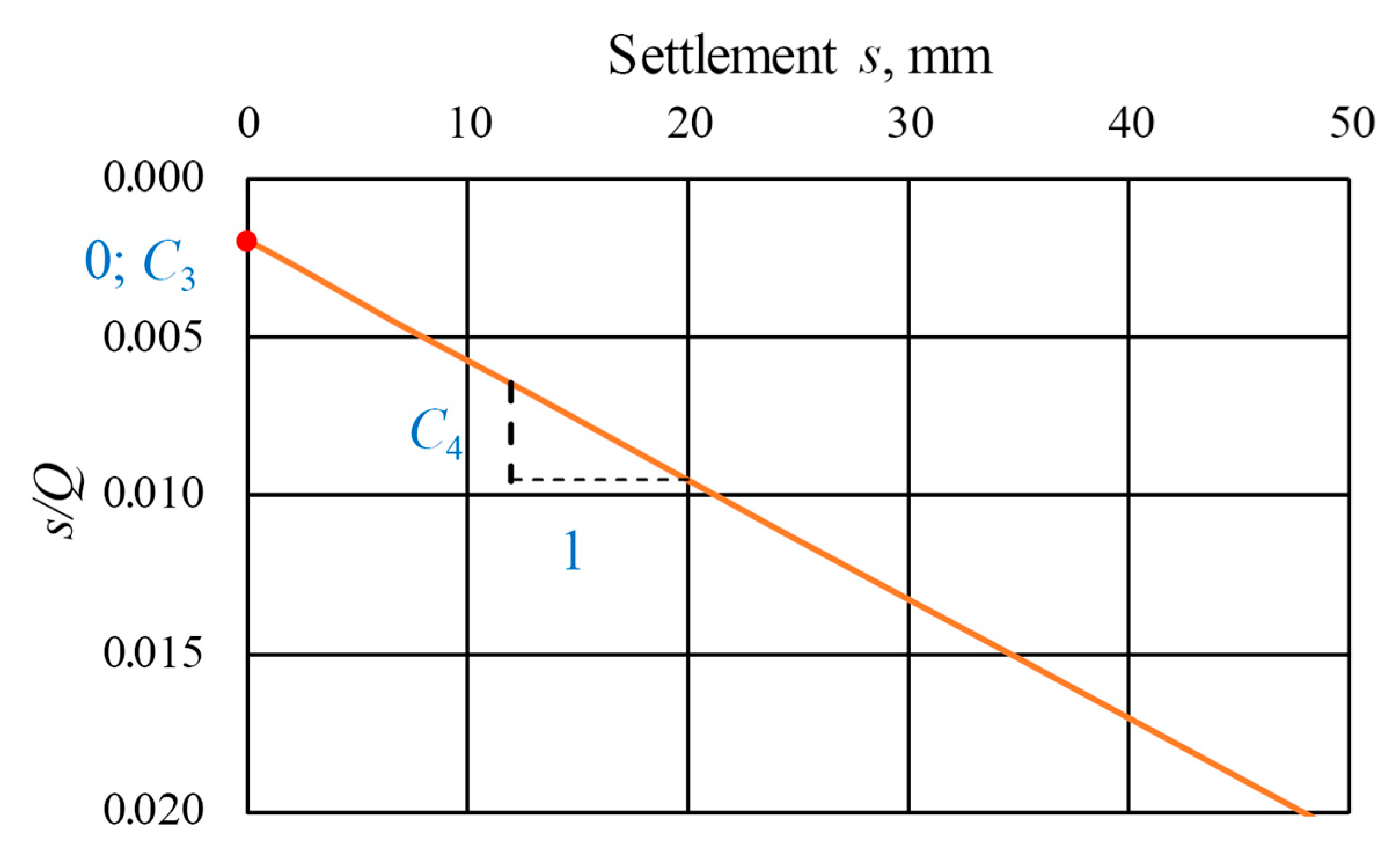 One of the best methods for analysing the behaviour of a pile loaded with axial force is static pile tests. However, the load–settlement graph of a static test is not a smooth curve, but a dotted line, where a straight line is drawn between individual observation points. The observed points are the settlement value for a specific load. The segment connecting two adjacent observation points would mean that the settlement amount increases proportionally with increasing of the load.