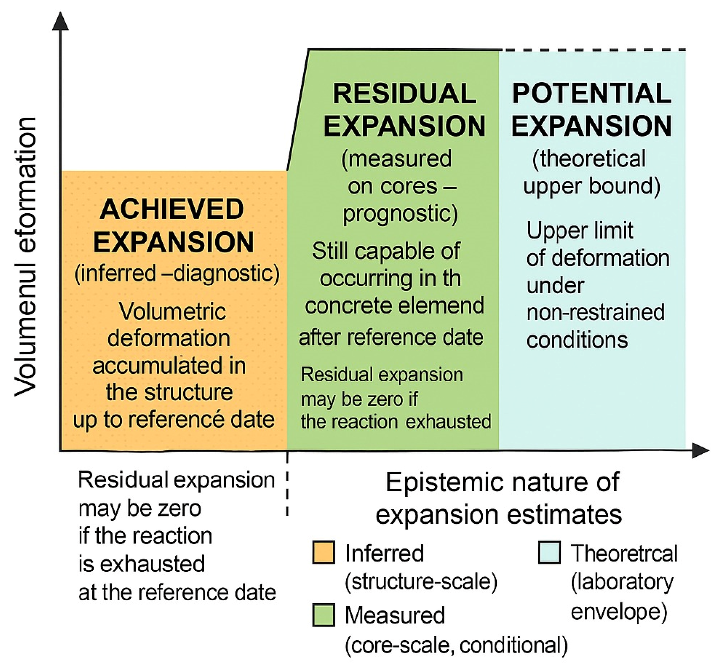 Residual expansion: the remaining portion still capable of occurring in the in-service concrete element after the reference date. It is estimated by monitoring cores under controlled conditions (temperature, relative humidity, storage medium)—under free and/or simulated restrained regimes—and serves a prognostic purpose, supporting risk projection and intervention decisions.