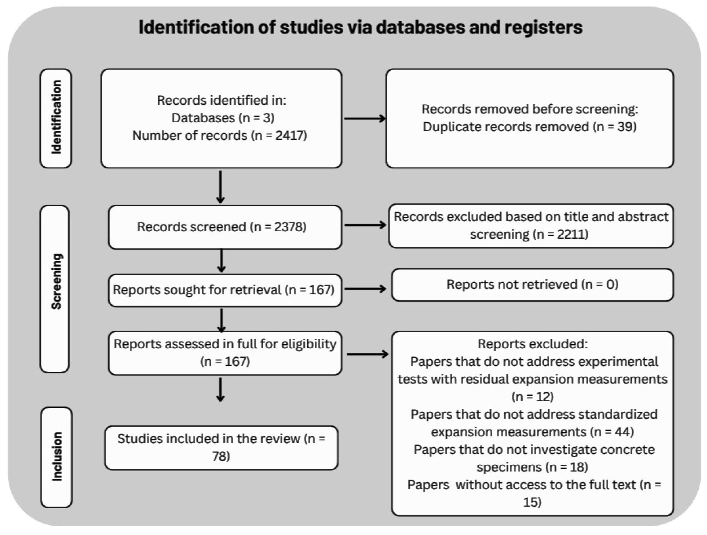 In addition, the terminological and symbolic diversity employed by the authors, especially in the way of citing norms, assays, and pathological manifestations, demanded a manual process of standardization and categorization of the data, susceptible to minor subjectivities. Another limitation refers to the unequal availability of information in the papers, since not all report expansion values, exact assay conditions, or limitations recognized by the authors themselves. During the database searches, only scientific papers from journals were included; however, the review did not restrict language, publication period, or country of origin, ensuring broad international and temporal coverage. Thus, the set of 78 studies analyzed is considered to offer a representative and robust overview of strategies for measuring residual expansion in reactive concretes.