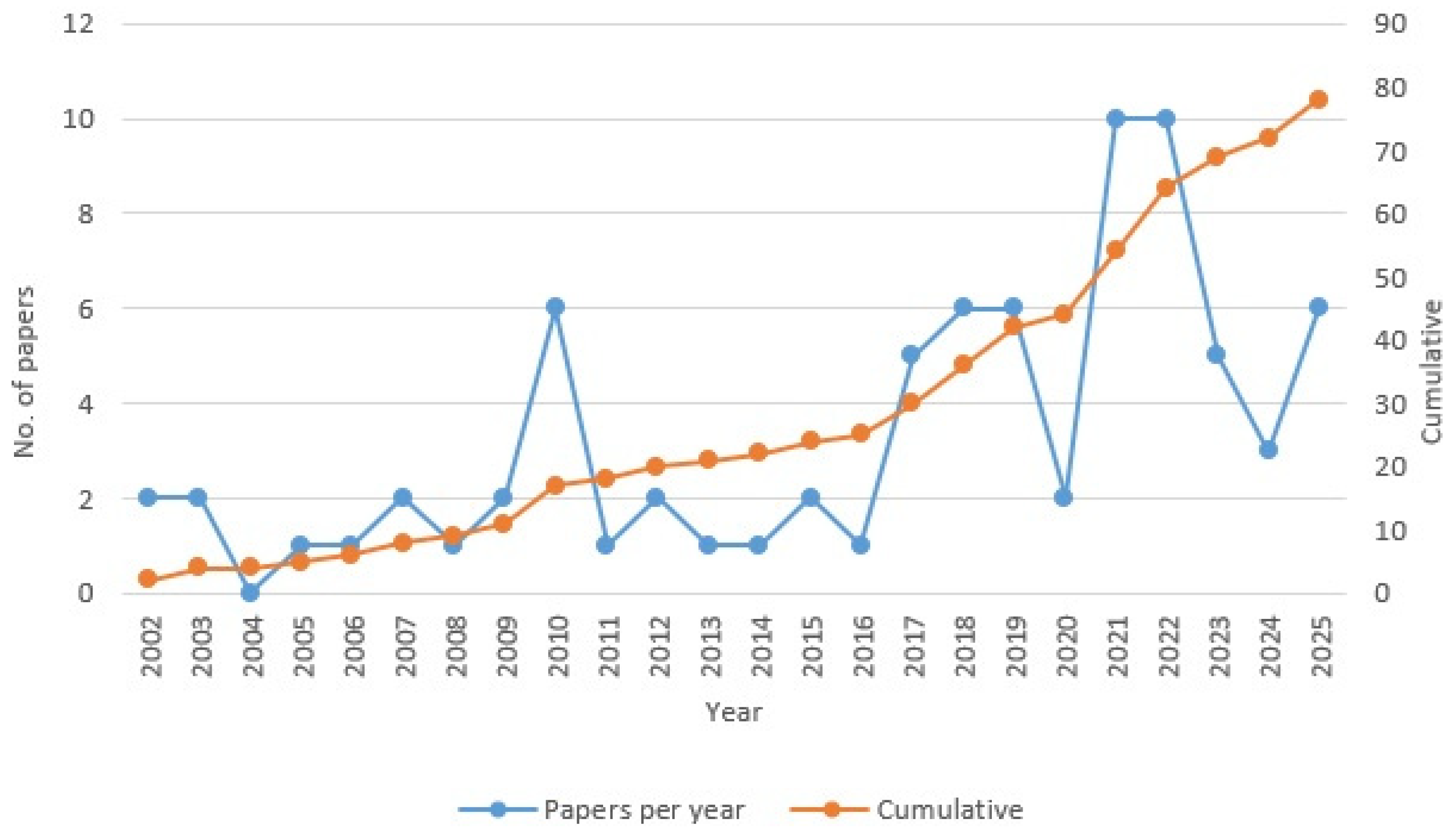 Figure 4) shows that research on residual expansion in concrete cores emerged in the early 2000s with a low annual output, followed by a gradual increase and periods of more intense activity. A first marked rise occurs around 2010, and a second, more pronounced growth phase begins in 2017. The years 2021 and 2022 correspond to the highest annual counts, with 10 papers each, and the cumulative curve indicates that approximately 62% of all publications (48 out of 78) were produced from 2018 onward. This pattern highlights the consolidation and growing relevance of residual expansion in concrete cores as a research topic in recent years. The cumulative curve shows a slow initial growth followed by a marked acceleration from 2017 onward, indicating that most of the publications on residual expansion in concrete cores have been produced in the last few years.