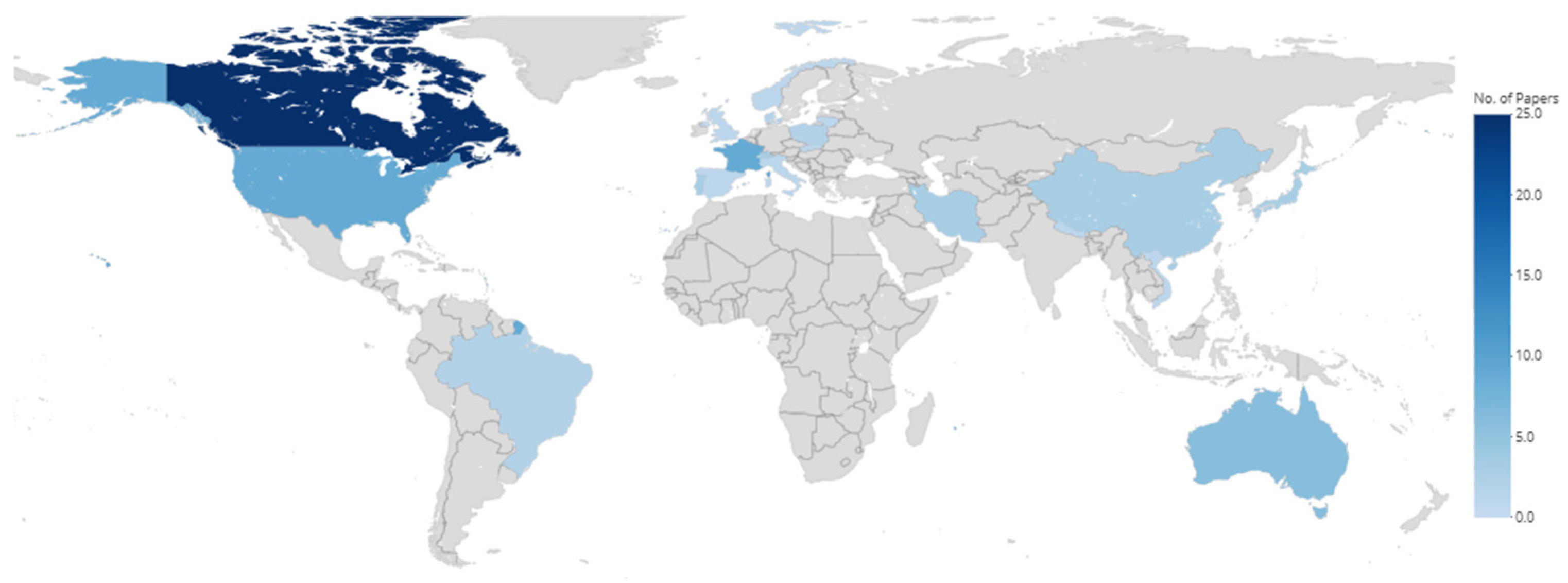 The scientific production is concentrated mainly in countries with a strong tradition in infrastructure research and studies on expansive reactions, particularly those related to ASR. Canada, France, and the United States are the leading contributors. Canada accounts for approximately 32% of all studies—reflecting its historical engagement in ASR monitoring of transportation and energy infrastructure since the 1980s, which positioned the country as a global reference in diagnostic and mitigation protocols [