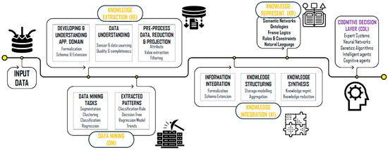 Figure 1 summarizes three pillars that enable this progression: Knowledge Extraction (KE), Knowledge Integration (KI), and Knowledge Representation (KR), which together address challenges in structuring, linking, and interpreting large, multi-source datasets [15]. KE involves data preparation, Data Mining (DM) tasks for information, and developing new knowledge from data [16]—feature extraction, segmentation, clustering, and classification [17]. KI synthesizes and aligns the multiple knowledge sources, understanding, representing, and layering them by domains. KR then formalizes this knowledge—e.g., ontologies and rules expressed in machine-readable languages—to enable constraint checking, logical inference, and workflow automation with reduced human input [2]. The decision-making and inference functions that consume these KR fall in the Cognitive Decision Layer (CDL).