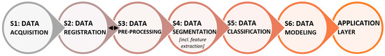 The workflow proceeds with S1 Acquisition, where point clouds are captured using sensors such as LiDAR or photogrammetric cameras. Collection parameters are also configured at this stage according to environmental and project-specific requirements (platform, trajectory, overlap, exposure). This is followed by S2 Registration, where multiple scans are aligned into a common frame using feature-based or Iterative Closest Point (ICP)-style methods, optionally constrained by Global Navigation Satellite System (GNSS)/Inertial Measurement Unit (IMU). S3 Pre-processing then improves data quality through operations such as outlier removal, denoising, subsampling, and error correction.