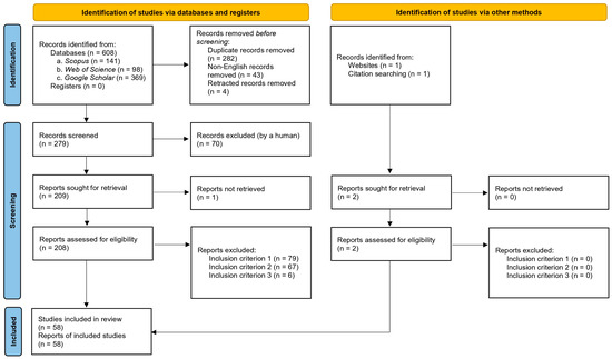 Following PRISMA 2020 [26], we used three identification techniques: (1) structured database searches, (2) backward snowballing (cited references), and (3) forward snowballing (citing references) [25]. Additionally, the authors’ domain expertise contributed to identifying key researchers and relevant terms, as recommended in [28]. Searches placed no date limits, and the last search was in June 2025. A PRISMA flow diagram is in Figure 3.