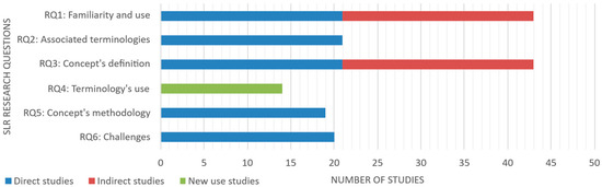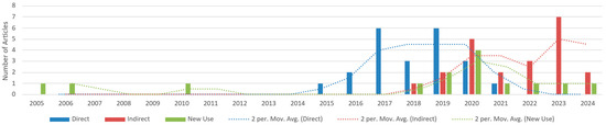 Temporal distribution of Direct, Indirect, and New Use studies (2005–2024).