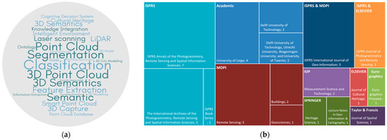 Publication venues cluster within geomatics and remote sensing—most notably the ISPRS Annals, ISPRS Archives, ISPRS International Journal of Geo-Information, and Remote Sensing—with grey literature outputs from academic outlets (e.g., University of Liège; Delft University of Technology). A treemap of venues appears in Figure 5b.