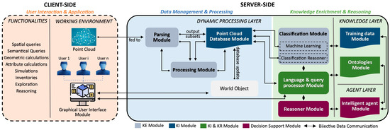 S4 Segmentation partitions the cloud into coherent regions, supported by Feature Extraction, which derives attributes such as curvature, eigen-features, local descriptors, or learned embeddings for pattern recognition. In S5 Classification, instances of segmented entities are localized (object detection/instance segmentation), and semantic labels are assigned using methods like rule-based systems, Machine Learning (ML) models, or manual annotation. Finally, S6 Data Modeling (and Structuring) maps labeled entities to application schemas (e.g., Industry Foundation Classes (IFC) for Building Information Modeling (BIM), City Geography Markup Language (CityGML) for urban models, domain taxonomies for heritage) and packages them for the Application Layer. In traditional workflows, these outputs feed application-specific analytics; in SPC settings, once formalized via KR, they enable CDL functions for automated reasoning.