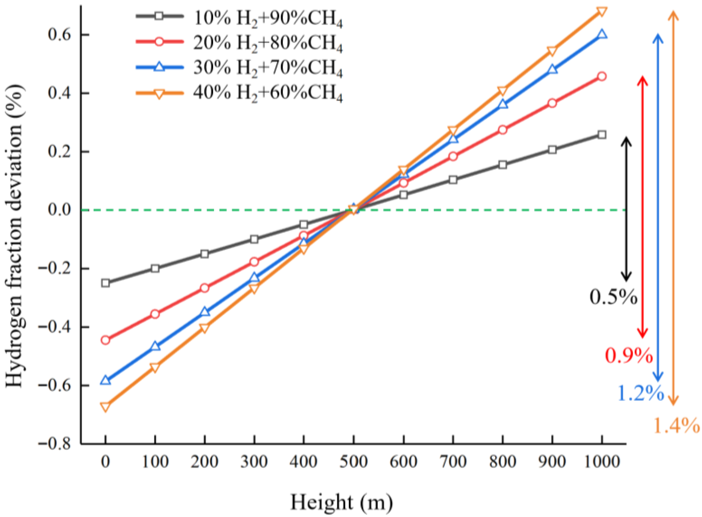 - Cen, K.; Su, L.; Wen, Y.; Song, B.; Zeng, Z.; Li, L.; Li, Q. Stratification characteristics of hydrogen-blended natural gas for gas risers inside residential users. Int. J. Green Energy 2024, 21, 3201–3217. [Google Scholar] [CrossRef]
