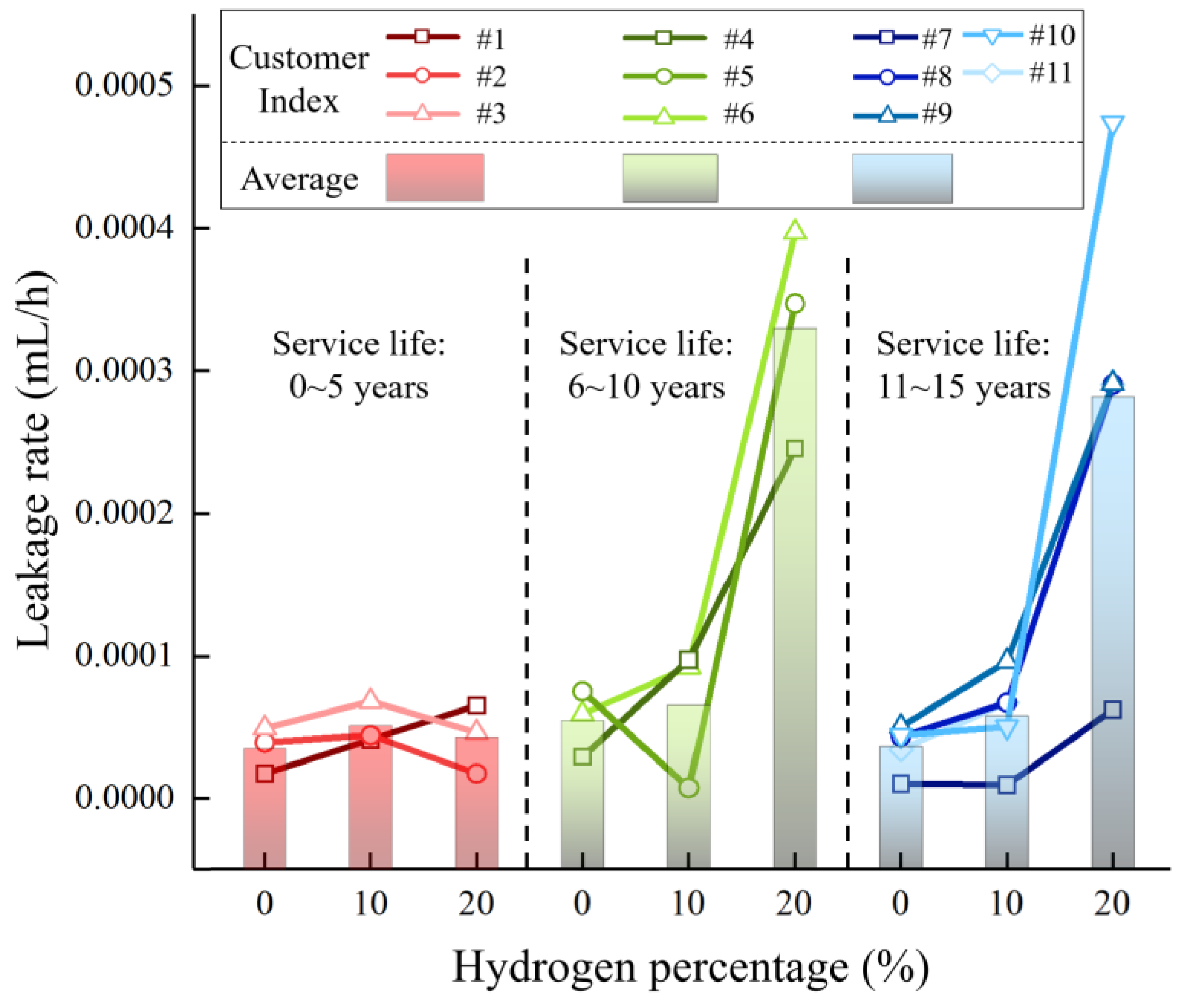 - Systems with appliances under five years of service maintain stable airtightness under hydrogen blending, whereas systems with longer service life exhibit increased leakage due to material aging and loosening at pipeline–appliance connections. Therefore, gas systems with long service-life appliances require focused inspection and maintenance in hydrogen blending projects. Gas meter leakage rates under 10% hydrogen blending are below 3 mL/h, satisfying safety requirements.