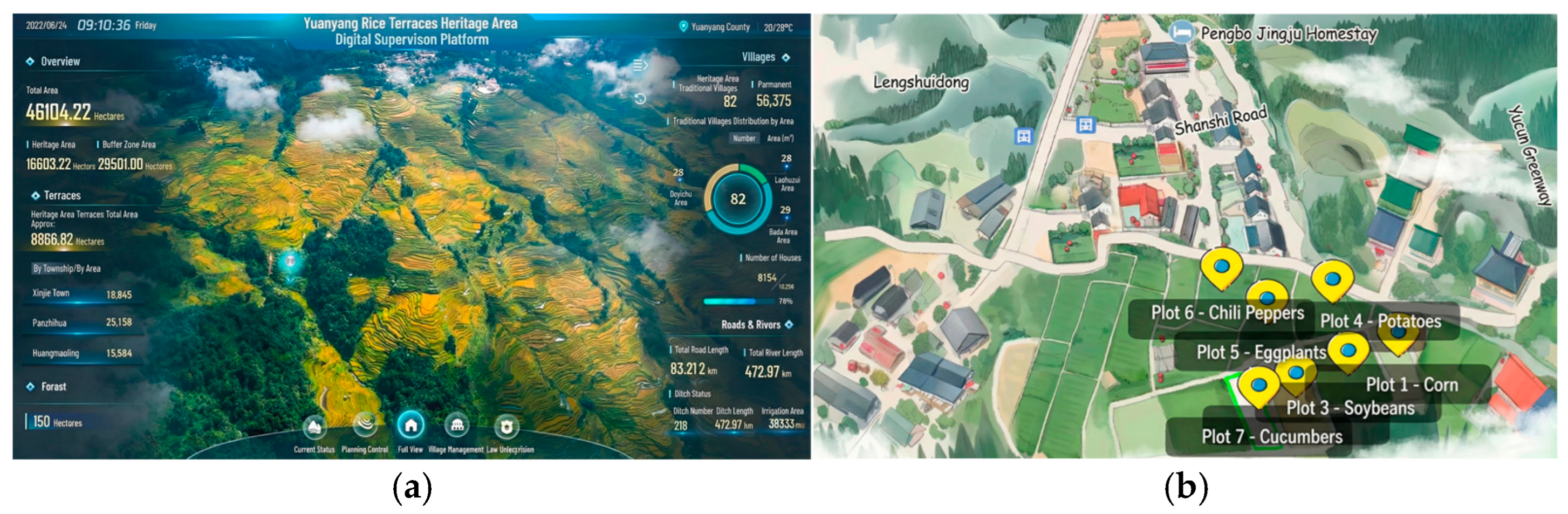 | Digital technology application | “Smart Yu Village” integrated digital governance platform | “Smart Terraces” ecological and cultural monitoring system |