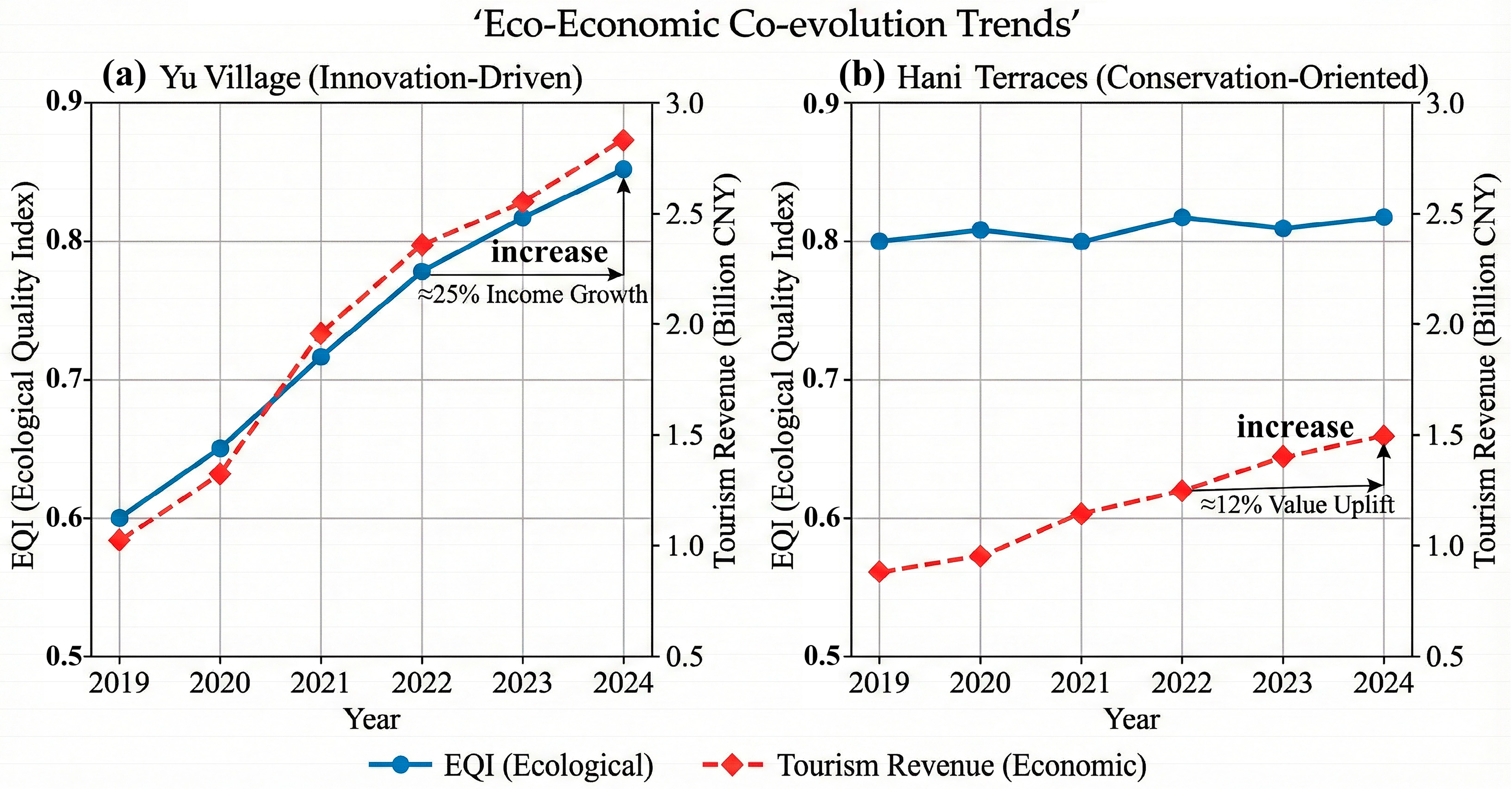 | Tourism Revenue Growth Rate (RG_2023) | 25% (Industry Transformation Driven) | 12% (Value Enhancement Driven) | Economic model differences: Yu Village follows an “Ecology+” approach, creating new industries; Hani Terraces follow a “Culture+” approach, enhancing traditional industry value. Growth rates reflect differing development stages and strategic focus. |