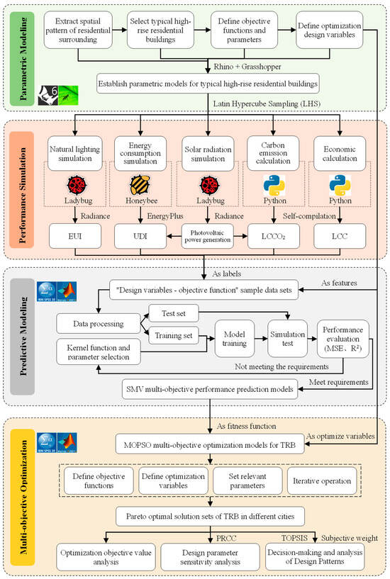 This paper proposes a multi-objective optimization design procedure for high-rise residential buildings, which integrates parametric design and simulation, machine learning prediction, algorithm optimization, and multi-attribute decision making, as shown in Figure 1. A parametric model is established using the Rhino–Grasshopper platform, with controllable variables including building orientation, window–wall ratio, sunshade length, bedroom width and depth, the thickness of the exterior wall and roof insulation layers, and window types. Latin Hypercube Sampling (LHS) is employed to generate diverse high-rise residential design schemes. Honeybee, Ladybug, and self-compiled programs are utilized to simulate energy consumption intensity, useful daylight illuminance, and solar radiation, as well as to calculate life cycle carbon emissions and costs. Subsequently, the sample dataset of “design parameters–objective functions” is generated. Based on this dataset, the SVM algorithm is adopted to construct and verify a performance prediction model. Ultimately, the prediction performance is defined as the objective function in the MOPSO algorithm to search for the Pareto optimal solutions, and the TOPSIS multi-attribute decision-making method is utilized to establish an optimized design pattern for high-rise residential buildings. The computer resources utilized are as follows: CPU: 11th Gen Intel(R) Core i7–11800H 2.30 GHz, RAM: 16.0 GB, and GPU: NVIDIA GeForce RTX 3060.