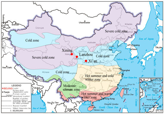 The climate differences addressed in this paper are mainly reflected in thermal design zoning and solar energy resource zoning. In accordance with the provisions of “GB50176–2016 Thermal Design Code for Civil Building” [48] and “GB/T31155–2014 Classification of Solar Energy Resources—Global Radiation” [49], combined with the regional characteristics of the northwest region and the similarities of high-rise residential building design, Xi’an (Shaanxi Province), Lanzhou (Gansu Province), and Xining (Qinghai Province) were selected as typical cities. The climate differences among cities are shown in Table 1, and the location distribution is shown in Figure 2.