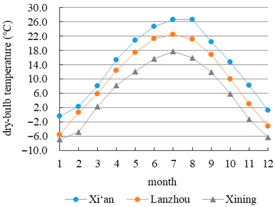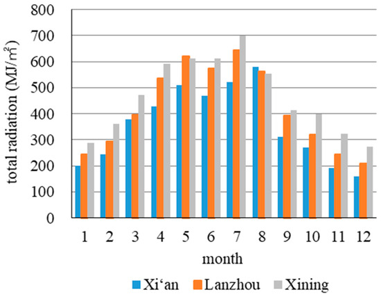 The mean monthly dry bulb temperature and total amount of solar radiation of the three cities are presented in Figure 3 and Figure 4. The monthly average temperature changes are similar in each city, with the minimum value occurring in January and the maximum value in July. The annual average temperatures of Xi’an, Lanzhou, and Xining are 14.1 °C, 10.2 °C, and 5.9 °C, respectively, while their corresponding annual total solar radiations are 4262.1 MJ/m2, 5041.9 MJ/m2, and 5601.0 MJ/m2 (1 kW·h/m2 ≈ 3.6 MJ/m2). It can be seen that the three cities exhibit significant differences in temperature, solar radiation, etc. Therefore, in the design process, the impact of climatic differences on building performance and the values of design parameters should be fully considered.