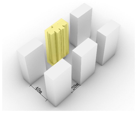 High-rise residences are usually presented in a cluster layout form. Surrounding buildings can affect sunlight access, natural lighting, etc. Therefore, the surrounding spatial patterns of high-rise residences were first analyzed and extracted. According to the analysis of land use scale and floor area ratio of high-rise residential area, a parallel layout consisting of six buildings arranged in two rows and three columns is adopted, as illustrated in Figure 5. The high-rise residence (yellow blocks) located at the most disadvantageous position is selected as the research object to ensure the resulting design scheme has broader applicability. Combined with the building spacing requirements for residential buildings specified in “GB 50180-2018 Standard for Urban Residential Area Planning and Design” [50], and through sunlight simulation analysis, the north–south spacing is determined to be 40 m, with the east–west spacing set at 20 m. In line with the survey results, the high-rise residences are defined as 26-story buildings with a south-facing orientation.