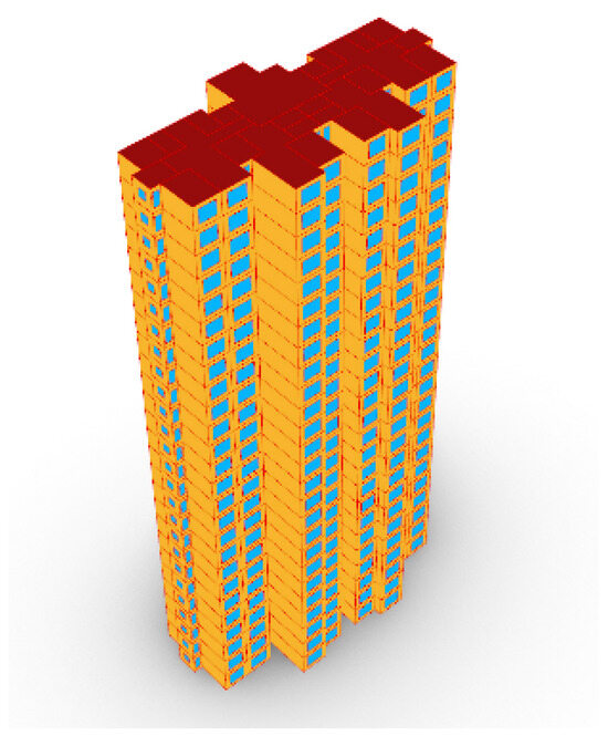 For single-building high-rise residence, the two-elevator, four-unit layout is the predominant floor plan form, accounting for 85% of the survey samples. Accordingly, this layout is designated as the typical floor plan configuration for high-rise residences, with the standard floor plan shown in Figure 6, where it integrates a three-bedroom, two-living room layout with a two-bedroom, two-living room layout. The specific design parameters are presented in Table 2, the building envelope construction and heat transfer coefficients are detailed in Table 3, and the parametric model is depicted in Figure 7.