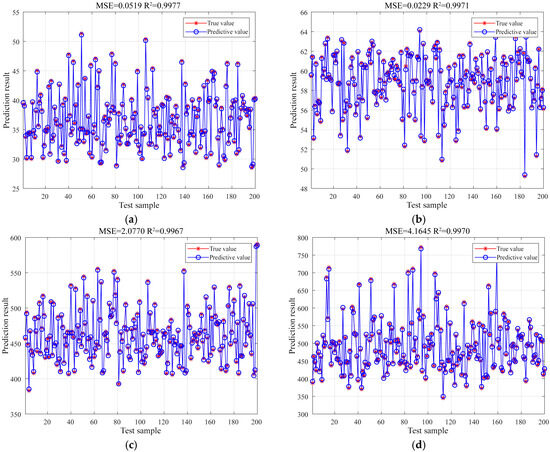 Test results of the prediction model for typical high-rise residence in Lanzhou. (a) BEI; (b) UDI; (c) LCCO2; and (d) LCC.