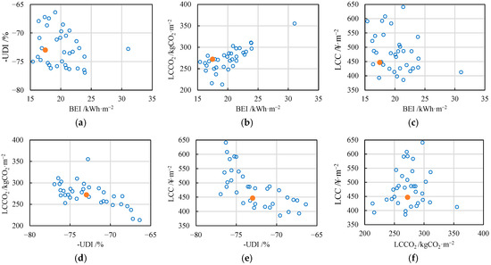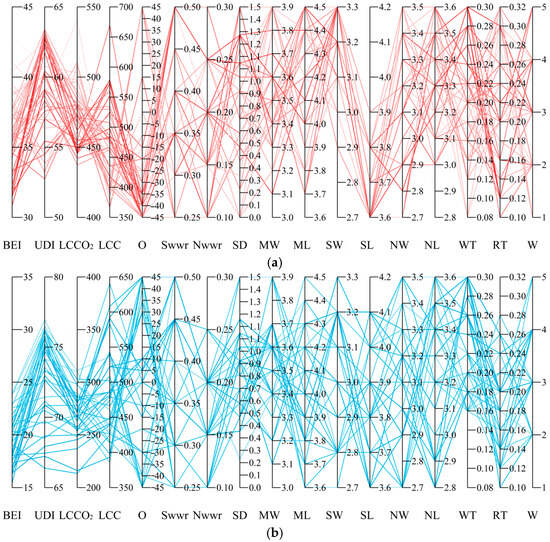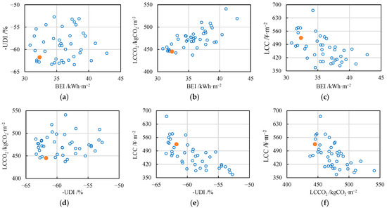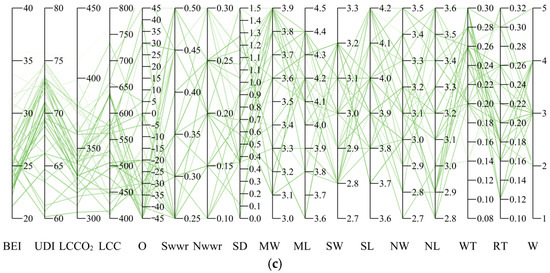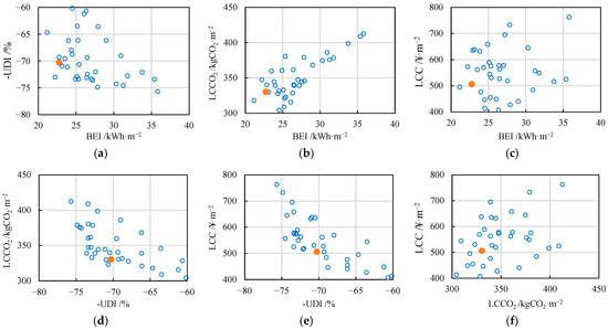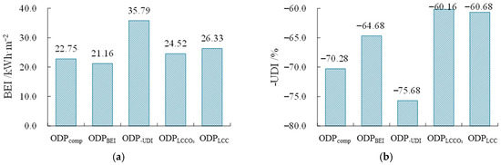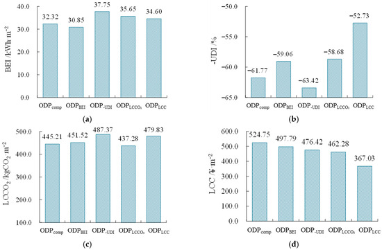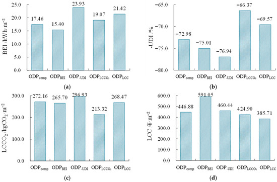 It is worth noting that the comprehensive optimal design pattern is derived under the assumption of equal weights assigned to the four objectives. However, in practical design processes, all solutions within the Pareto optimal solution set are feasible. We can select the appropriate solution from the perspective of optimization objective. If the four objectives are of equal importance, the scheme shown in Figure 22 (ODPcomp) is recommended. If a specific objective is prioritized for optimization to achieve the best performance, the single-objective optimal design schemes presented in Section 3.3 (ODPBEI, ODP-UDI, ODPLCCO2, and ODPLCC) can be selected. For other scenarios, screening can be conducted by sequentially restricting the optimization objectives layer by layer. Firstly, define a value range for the first optimization objective, which helps filter out some solutions. If no further restrictions on other optimization objectives are defined, the TOPSIS method can be used to make further decisions among the remaining solutions. If additional optimization objectives still need to be constrained, set a value range for the second optimization objective and repeat the filtering process to support decision making. In addition, the values of design variables can also be restricted to filter schemes. For instance, in practical design, based on the ranking from sensitivity analysis, parameters with greater impact should be controlled first, and their value ranges can be defined initially. Then, schemes in the Pareto solution set that meet the conditions can be selected for design decision making.