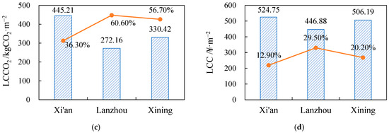 Therein, BEI is the building energy consumption intensity, kWh·m−2; A is the building area, m2; EH is the heating energy consumption, kWh; ηH is the heating system efficiency, taken as 0.8 [18]; EC is the cooling energy consumption, kWh; ηC is the cooling system efficiency, taken as 3.0 [54]; EL is the lighting energy consumption, kWh; and Epv is the yearly power output of photovoltaic systems, kWh.