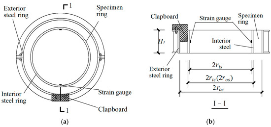 In the partially restrained ring tests without a clapboard, the stress in the concrete ring can be obtained from Equation (5) as follows [