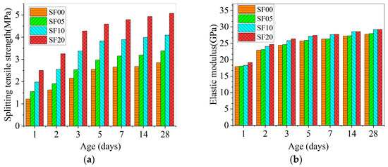 31]. After the samples were demolded, they were additionally subjected to standard curing conditions. The splitting tensile strength tests were conducted at the curing ages of 1, 2, 3, 5, 7, 14, and 28 d, and so were the dynamic elastic modulus tests [