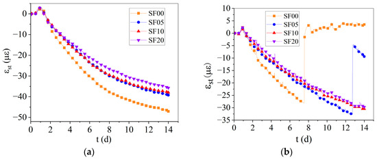 Figure 5, the sudden drop in the strain in the interior steel ring for SF00 and SF05 indicates cracking of the concrete ring samples. Since the indicator of SF05 is greater than that of SF00, the crack resistance of SF05 is better than that of SF00. In contrast, the steel ring strain curves of SF10 and SF20 only show an ascending segment, and the cracking indicator of SF20 is smaller than that of SF10, indicating that SF20 has better crack resistance than does SF10. Furthermore, since the uncracked samples (SF10 and SF20) demonstrate superior performances to the cracked samples (SF00 and SF05), it can be concluded that the crack resistance improves with increasing steel fiber content in SFLWAC [