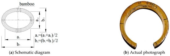 The Moso bamboo (Phyllostachys edulis) culms were harvested from Liyang District, Changzhou City, Jiangsu Province, China. The distance between the bamboo joints at 1.3 m height was 228.57 ± 21.81 mm, with an average outer diameter of 89.32 ± 9.19 mm, and the average wall thickness was 8.95 ± 0.74 mm. According to the Chinese standard GB/T 15780 [20], each group has 100 replications, where the average moisture content was 17.35 ± 5.17%, the volume shrinkage coefficient was 0.84 ± 0.46%, the air-dry density at 12% moisture content was 0.81 ± 0.07 g/cm3, and the total dry density was 0.76 ± 0.08 g/cm3.