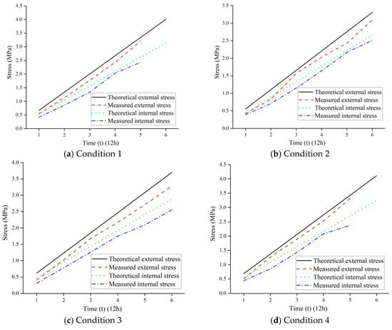 The measured tangential strain from strain gauges at the corresponding time points for each specimen under the four conditions (Table 3, Table 4, Table 5 and Table 6) was first averaged and then multiplied by the elastic modulus to obtain the measured tangential stress.