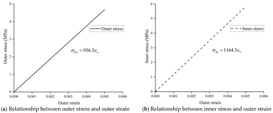 Based on the bamboo crack evaluation model, and neglecting defects without affecting the validity of the study, the bamboo was assumed to have a , 228 MPa, , b = 45 mm, a = 35 mm, c = 0.78, 0. By substituting these assumptions into Equations (4) and (5), the relationship between the tangential stress and the outer surface strain of raw bamboo is shown in Figure 4. Both the tangential outer and inner stresses of bamboo were proportional to the outer surface strain. As the outer surface strain decreased, the tangential outer and inner stresses gradually decreased.