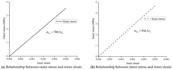 Based on the bamboo crack evaluation model, and neglecting defects without affecting the validity of the study, the bamboo was assumed to have a , 228 MPa, , b = 45 mm, a = 35 mm, c = 0.78, 0. By substituting these assumptions into Equations (4) and (5), the relationship between the tangential stress and the inner surface strain of raw bamboo is shown in Figure 5. Both the tangential outer and inner stresses of bamboo were proportional to the inner surface strain. As the inner surface strain decreased, the tangential outer and inner stresses gradually decreased.