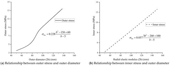 By substituting these assumptions into Equations (4) and (5), the relationship between tangential stress and outer diameter of raw bamboo is shown in Figure 7. As shown, both the tangential outer and inner stresses gradually decreased with decreasing outer diameter. From Figure 7a, when the outer diameter ranged from 80 to 100 mm, the rate of increase in outer surface stress was elevated. Therefore, for bamboo with outer diameters above or below 80 mm, different protective measures can be applied to prevent cracking.