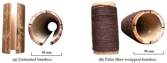 For surface treatment, 10 segments were selected from each bamboo age group and polished with 80-mesh sandpaper. The impregnated palm fiber ropes were then wrapped around the sanded outer surface of the bamboo specimens, sealed with silicone paper, and fixed with copper wires. The specimens were cured for two days under controlled conditions (relative humidity: 65 ± 5%, temperature: 20 ± 2 °C). After curing, the copper wires and silicone paper were removed to complete specimen preparation.