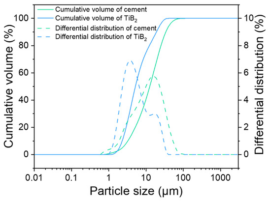 White Portland cement (P.W-1 52.5) with an average particle size (d50) of 14.2 μm was selected, and the chemical composition was measured by X-ray fluorescence (XRF, Panalytical B.V., NL, Almelo, The Netherlands) and is listed in Table 1. TiB2 powder was provided by the Jiamai (Liaoning) New Materials Co., Ltd. (Jinzhou, China) with an average particle size (d50) of 3.5 μm, a purity of 99.5%, and a bulk density of 4.52 kg/m3. Powdered hydroxypropyl methylcellulose (HPMC) with a viscosity of 200,000 Pa·s was purchased from Shanghai Chenqi Chemical Technology Co., Ltd. (Shanghai, China). Tap water was used for sample preparation. Isopropyl alcohol with a concentration of 99.7% was purchased from Sinopharm Chemical Reagent Co., Ltd. (Shanghai, China). Figure 1 shows the particle size distribution of white cement and TiB2 recorded by a laser particle size analyser (Mastersize 3000 Malvern Panalytical, Ltd., Malvern, UK).