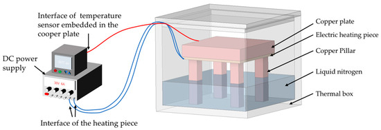 As shown in Figure 2, a self-made mould made of polytetrafluoroethylene (PTFE) sides and a copper subface was used for preparing samples by freeze-casting. The internal dimensions of the square holes in the mould were 20 × 20 × 20 mm3, and the PTFE sides were fixed to the copper subface using copper screws. Before using the mould, coat its interior with a water-based release agent that does not affect the mould. As shown in Figure 3, the freezing system consists of four copper pillars (40 × 40 × 100 mm3), one copper plate (350 × 350 × 15 mm3) with a temperature sensor in the centre, a heating sheet, a power supply, and an insulation box.