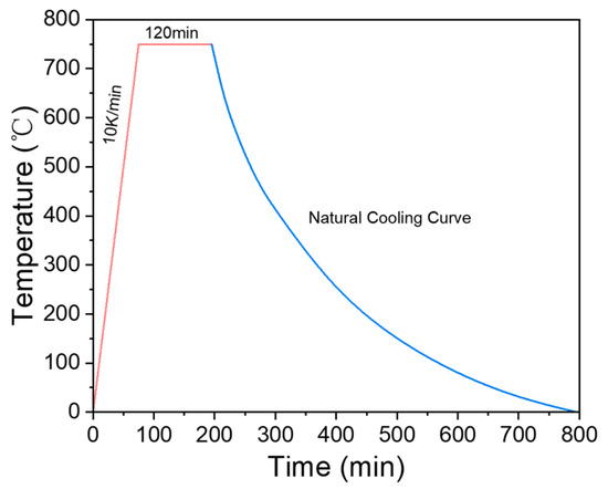 After drying the regular-cast and freeze-casting samples in an oven for 24 h at 50 °C, the samples were placed in a muffle furnace. The samples were placed in the chamber of the muffle furnace in an air atmosphere. The muffle furnace was heated at a constant rate of 10 K/min to 750 °C, held at that maximum temperature for 120 min, and then naturally cooled to room temperature. The temperature protocol set in the muffle furnace is shown in Figure 4.
