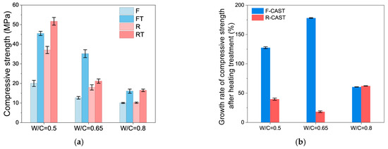 As shown in Figure 5b, at W/C values of 0.5, 0.65 and 0.8, respectively, the compressive strength values of samples of FT groups increased by 127.43%, 178.12% and 60.33%, respectively, and those of RT groups increased by 39.52%, 17.99% and 62.03%, respectively. When the W/C ratio is 0.5, the Rcc of samples in the 0.5FT group is approximately 3 times that in the 0.5RT group. In contrast, the Rcc of samples in the 0.65FT group is approximately 10 times that in the 0.65RT group when the W/C ratio increased to 0.65. While at a W/C ratio of 0.8, there is no significant difference in Rcc values between samples prepared by the two casting methods. The compressive strength values of samples with a W/C ratio of 0.8 prepared by freeze-casting and regular casting methods before heating are very close, which may be because the pore volumes caused by both preparation methods are similar. Moreover, for the samples obtained through regular casting, the Rcc values first decrease and then increase with the W/C ratios, which is the opposite of the rule that changes for the samples prepared by the freeze-casting method.