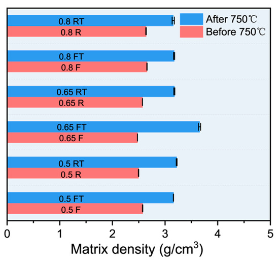 The matrix density values of the samples are shown in Figure 6. Before heating treatment, the matrix density values of samples prepared by the regular casting method slightly increase with the increase in the W/C ratio. While for the samples prepared by the freeze-casting method, the matrix density values first slightly decrease and then increase with the increase in W/C ratios before heating treatment. After heating treatment, the matrix density values of all samples increase significantly compared with the original samples. For the samples in the 0.65F group with a W/C ratio of 0.65, the matrix density increased by 47.7% after high-temperature treatment. Before heating treatment, the matrix density values of the samples in the 0.65F group with the W/C ratio of 0.65 are smaller than those in the 0.65R group. After heating treatment, the matrix density values of the samples in the 0.65F group are much larger than those in the 0.65R group. On the contrary, when the W/C ratio of samples is 0.5, before heating treatment, the matrix density values of the samples in the 0.5F group are larger than those in the 0.5R group.