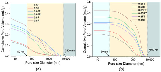 Figure 8a shows that before heating treatment, when the W/C is a constant value, the freeze-casting process mainly affects the volume of pores between 50 and 7500 nm. For example, the cumulative pore volume of the sample in the 0.65F group between 50 and 7500 nm is much larger than that in the 0.65R group. In Figure 8b, after heating treatment at a maximum temperature of 750 °C, for the sample with the same W/C ratio, the cumulative pore volumes of samples prepared by the freeze-casting method are much smaller than those of samples prepared by the regular casting method. Moreover, the cumulative pore volume curves of each sample significantly vary in the pore size diameter range from 50 to 7500 nm. As a result, the macropore size distribution and volume are affected greatly by the freeze-casting process.