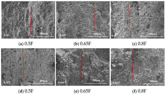 Due to the measurement limitations of MIP analysis, the pores with a diameter larger than 7500 nm can hardly be recorded, as shown in Figure 8. For a better understanding of the changes in megapore samples prepared by the F-CAST method and heating treatment, the morphology analysis of hardened samples is necessary. Figure 9 shows the SEM images of samples before and after heating treatment at low magnifications (×100 to ×250). The red lines in Figure 9 are the indication lines for the direction of the micro channels in the cementitious matrix. In Figure 9, the width values of the microchannels in samples of each group are between 50 and 100 µm, and are much larger than 7500 nm. The microchannels are distributed evenly in the vertical sections of the samples in each group.