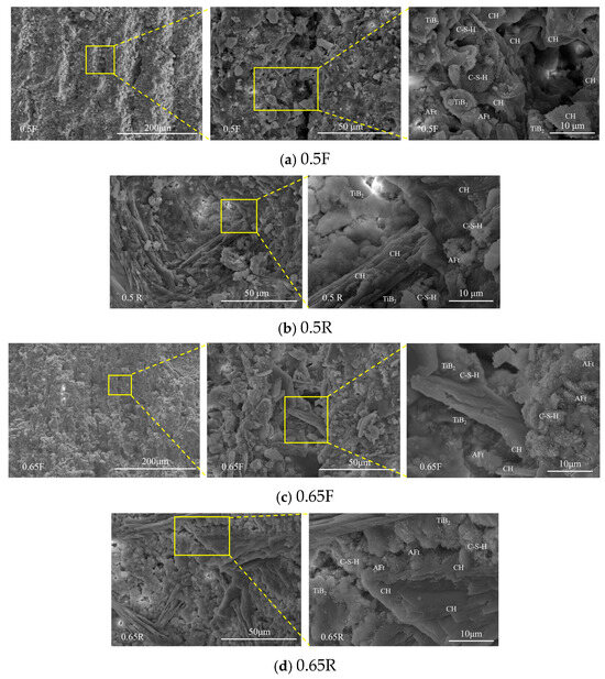 Figure 10 shows the SEM images of samples in each group after casting before heating treatment. As shown in Figure 10a,c,e, distinct pore structures with microchannels are detected in the samples prepared by the freeze-casting method (in 0.5F, 0.65F and 0.8F groups). With the increase in W/C ratio, the width of the microchannels becomes larger, and the microstructure becomes looser, which is caused by different contents of solid phases. It can also be observed that the matrix near the microchannel edges is denser, with a large amount of hexagonal calcium hydroxide (CH), calcium silicate hydrate (C-S-H) gels, and TiB2 particles squeezing and enveloping each other, accompanied by a small amount of needle-rod-like ettringite (AFt), which may be because of the ice crystal compression during the freeze-casting process. For the samples obtained through regular casting method, as shown in Figure 10b,d,f, the matrix gradually shifts from dense to incompact as the W/C ratio increases. Compared with the samples prepared by the regular casting method, the samples obtained through freeze-casting with the same original W/C ratio contain more directional pores and channels, resulting in a weak compressive strength. Those phenomena of cement hydrates in hardened samples can explain the results of the changing compressive strength values described in Section 3.1.