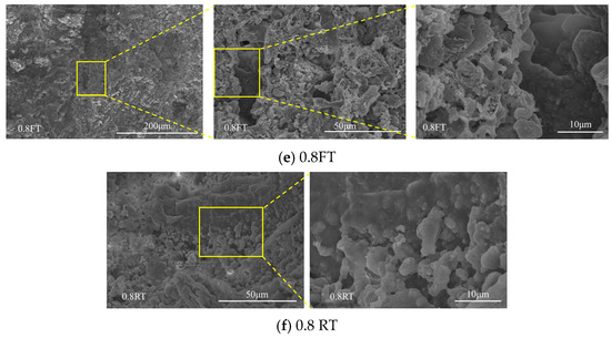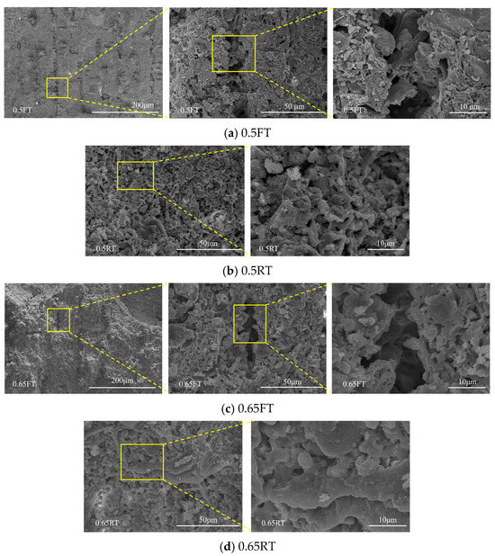 Figure 13b shows the XRD patterns of the samples after heating treatment. In Figure 13b, the peaks of new crystalline phases, such as TiO2 (Rutile), Perovskite, Takedaite, Titanite and Sibirskite, are detected in the pattern curves of all samples. Here, it needs to be pointed out that no CaO peaks are detected in the XRD pattern curves of all samples after heating treatment, indicating that the decomposed Ca(OH)2 fully participated in the high-temperature chemical reactions without residue. Moreover, the XRD patterns of the samples in the 0.5FT group with a W/C ratio of 0.5 were different from those of the other groups, which had peaks of TiB2. In comparison, there is barely any TiB2 detected in the other groups. These results indicate that TiB2 particles in samples of the 0.5FT group are excessive for the chemical reactions of high-temperature ceramicization, but for samples in other groups with larger original W/C ratios, all added TiB2 particles participate in the chemical reactions. Under the effect of high-temperature treatment, by the reaction among TiB2 particles, the cement hydrates and oxygen, the products form a denser layer on the sample surface, resulting in the inability of TiB2 in the sample to react with the outside air. Compared the XRD patterns of samples in the 0.5RT and 0.5FT groups, the main peak values of TiB2 of the samples in the 0.5FT group are lower than those in the 0.5RT group.