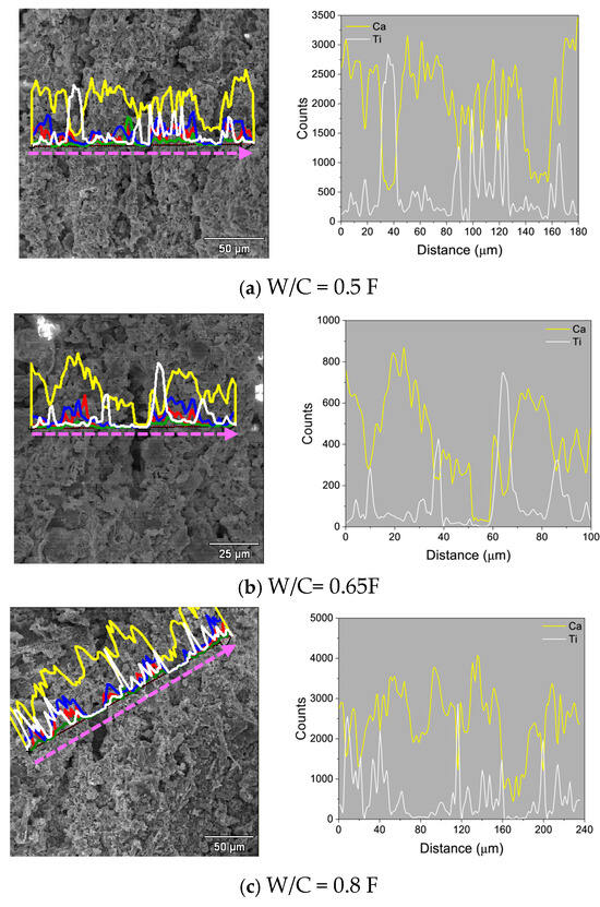 The above results suggest that the freeze-casting process with a certain W/C ratio (or liquid-to-solid ratio) promotes TiB2 and cement particles to concentrate near ice crystals. After the ice crystals melt, the solid particles form the walls of the micropores and microchannels in the hardened samples. To verify this speculation, line-scanning EDS is used to detect the elements (Ti: yellow line, Ca: white line, Si: blue line, O: red line, Mg: green line) distribution across the micropores and microchannels in samples after heating treatment. The line-scanning EDS results of samples from 0.5F, 0.65F and 0.8F groups are shown in Figure 12. As shown in Figure 12a–c, in all the samples prepared by the freeze-casting method after heating treatment, a special phenomenon occurred. In Figure 12b, in the area near the micropores and microchannels, the content of Ti element increases, and the content of Ca element decreases. When the detection area is far away from the micropores and microchannels, the content of the Ca element increases, and the content of the Ti element decreases.