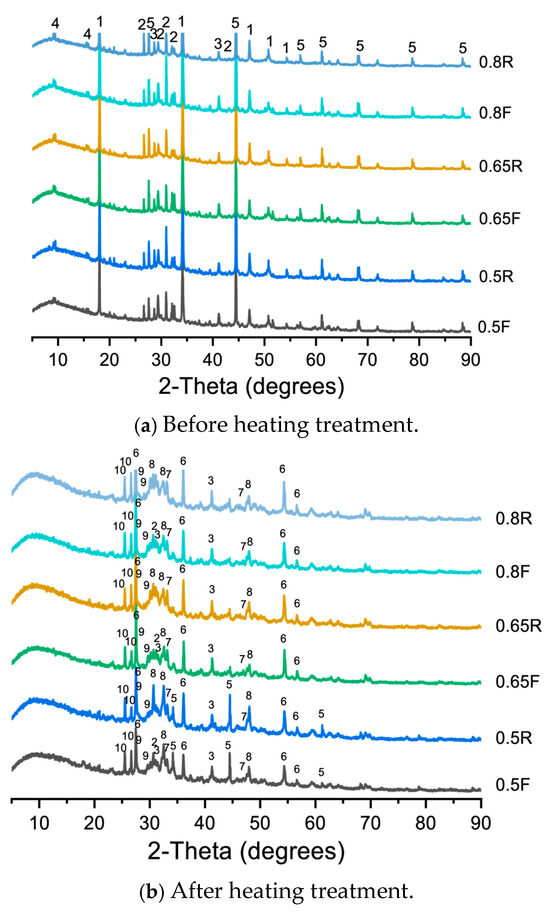 Figure 13a shows the XRD patterns of the samples before heating treatment. As shown in Figure 13a, the main mineral phases of samples prepared by the F-CAST and R-CAST methods are similar. The main cement hydrates are CH and AFt. The minerals in the hardened samples are C3S and C2S, and the added TiB2. Thus, the freeze-casting method does not affect the main hydrates and minerals in cementitious materials.