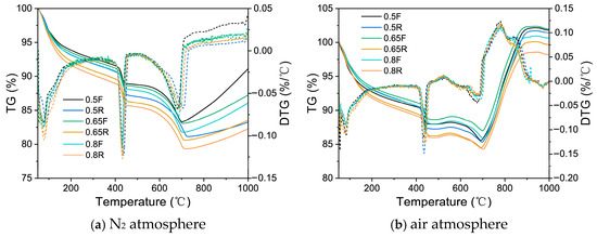 Figure 14a,b show the TG-DTG curves of samples before heating treatment under pure nitrogen and air atmospheres, respectively. For a typical TG curve of cementitious materials measured in pure nitrogen, an obvious mass loss occurs at the beginning of 80 °C due to evaporation of free water in cementitious materials [21,22], a significant mass loss is associated with Ca(OH)2 decomposition between approximately 420 °C and around 550 °C, and the mass loss between 650 °C and 900 °C is caused by the decomposition of CaCO3 [23,24]. As seen in Figure 14a, an ascending section of the TG curves of all samples has occurred when the temperature is higher than 700 °C, referring to a mass increase in the tested samples. Based on the results in XRD patterns shown in Figure 13a, no CaCO3 is detected in the samples before heating treatment. Therefore, this may represent the typical phenomenon of trace oxygen permeation in non-hermetic systems under nitrogen atmosphere testing, enabling partial chemical reactions between TiB2 particles, CaO, and air (oxygen). The relevant reaction Equations (2)–(5) were discussed in detail in the authors’ previous study [13,14]. As shown in Figure 14b, a much stronger mass increase section of the TG curve of samples in each group occurs when the temperature is between 700 °C and 900 °C. These mass increase sections represent the formation of new products during heating with the participation of the oxygen in air. By comparing the mass changes in the samples after 700 °C under the two atmospheres, it was evident that oxygen plays a crucial role in the reaction involving TiB2 during high-temperature exposure.