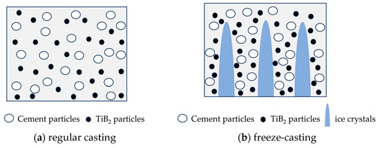 The freeze concentration technology takes advantage of the physical property differences between the solvent (usually water) and solute molecules at ultra-low temperatures. By ultra-low temperature freezing, water in the solution is precipitated in the form of pure ice crystals. Then, the ice crystals are separated and removed through melting or sublimation, ultimately increasing the concentration of solutes in the remaining solution [25,26,27]. From the perspective of thermodynamics, the core of the freeze concentration effect lies in the preferential crystallisation of water molecules and the repulsion effects among solutes. That is, water molecules will combine through hydrogen bonds to form regular ice crystals at low temperatures, while solute molecules, due to their larger size than the lattice gaps of ice crystals, are difficult to enter the lattice structures of ice crystals and can only remain in the unfrozen liquid around the ice crystals [28,29]. As shown in Figure 15, the distributions of cement and TiB2 particles in the samples are totally different during the two casting methods. The solid particles are distributed evenly and randomly in the samples by the regular casting method. During the freeze-casting process, as ice crystals grow, cement and TiB2 particles are redistributed and arranged in an orderly manner.
