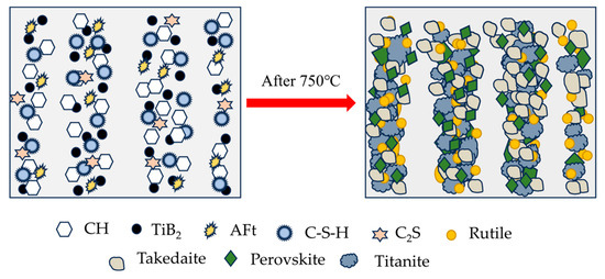 As mentioned in Section 3.2, the distributions of TiB2 and cement hydrates are greatly influenced by the freeze-casting process. The hydration reactions between cement particles and water occur during the thawing and curing processes. As shown in the SEM images of Figure 9 in Section 3.2, the cement hydrates, such as CH crystals and C-S-H gels, tend to grow into the microchannels and micropores formed after the ice melts. Thus, besides the initial W/C ratios in slurry, the liquid-to-solid ratios in the areas surrounding the ice crystals induced by the freeze concentration effect during the freeze-casting processes also affect the high-temperature ceramicization of TiB2 on cementitious matrix. A larger liquid-to-solid ratio in the areas surrounding the ice crystals indicates denser wall areas of the microchannels and micropores in the hardened cementitious samples containing TiB2 before and after heating treatment. Moreover, the synergistic effects of the initial W/C ratio and the freeze-casting method led to a regional liquid-to-solid ratio that dominates the contents and distributions of main cement hydrates, which are involved in the high-temperature chemical reactions of ceramicization. The distribution of TiB2 particles in the frozen samples, which is greatly influenced by the freeze concentration process, also affects the efficiency of the ceramicization effect. Figure 16 shows the potential enhancement mechanisms of the TiB2–cement composite prepared by the freeze-casting method with a heating post-treatment process. As shown in Figure 16, the cement hydrates and TiB2 particles are redistributed after the freeze-casting, thawing and curing processes. After the heating treatment, the cementitious skeleton is covered by the new reaction products, such as rutile, Takedaite, perovakite and titanite. These newly produced phases in samples are much stronger than the initial cement hydrates, resulting in a higher compressive strength value. Therefore, both the initial water-to-solid ratio and the freeze concentration process affect the formation and distribution of micropores and microchannels in the cementitious composites. The freeze concentration effect on the slurry with a proper initial water-to-solid ratio can effectively enhance the ceramicization effect during heating treatment, leading to a much stronger TiB2-modified cementitious composite.